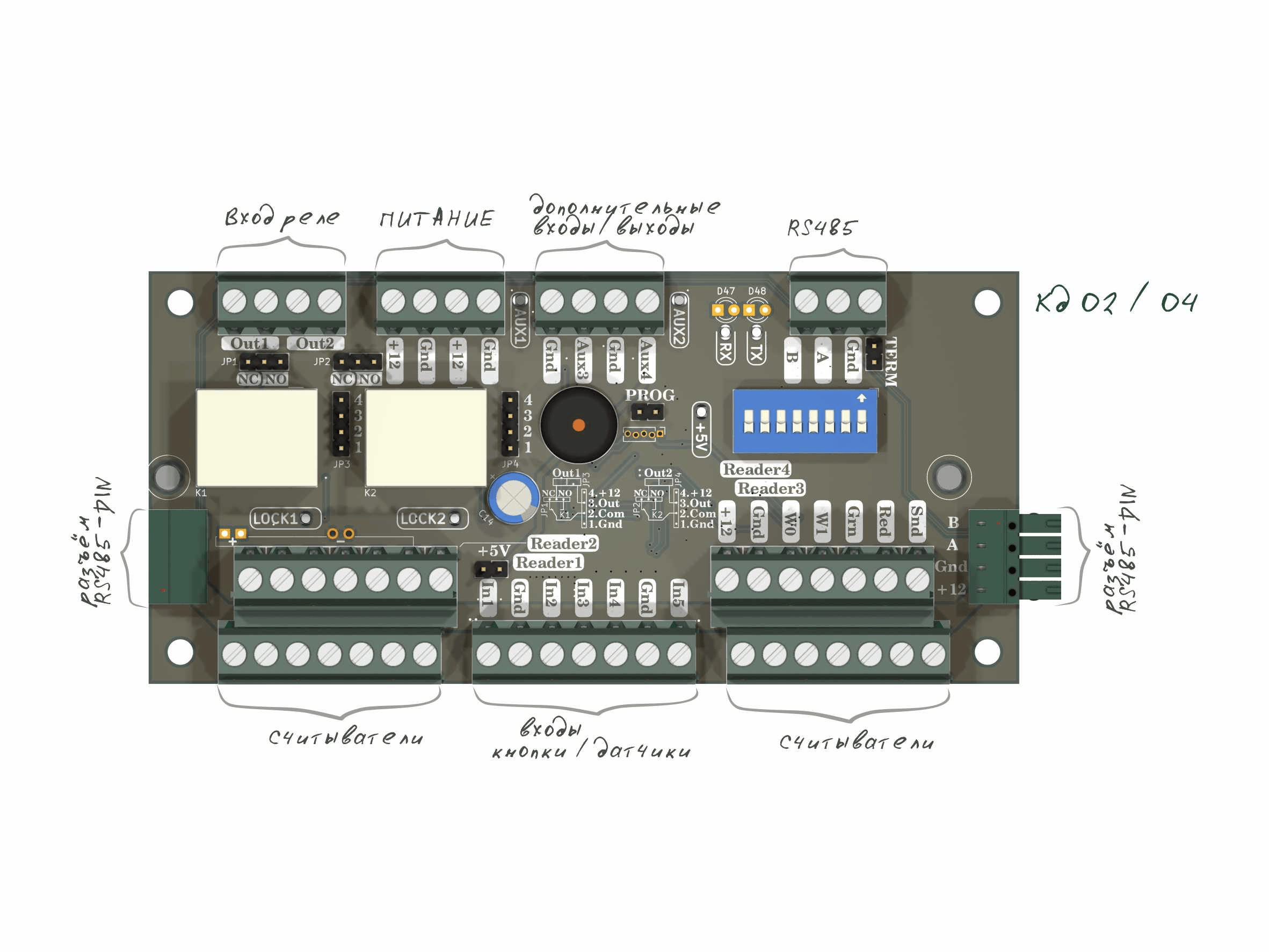 Контроллер КД-01-RS485 имеет два входа подключения считывателей, два входа датчиков прохода (герконов), три входа кнопок управления. Для управления замками используются два мощных полевых ключа. Выходы подключения замков имеют защиту от токов самоиндукции.
