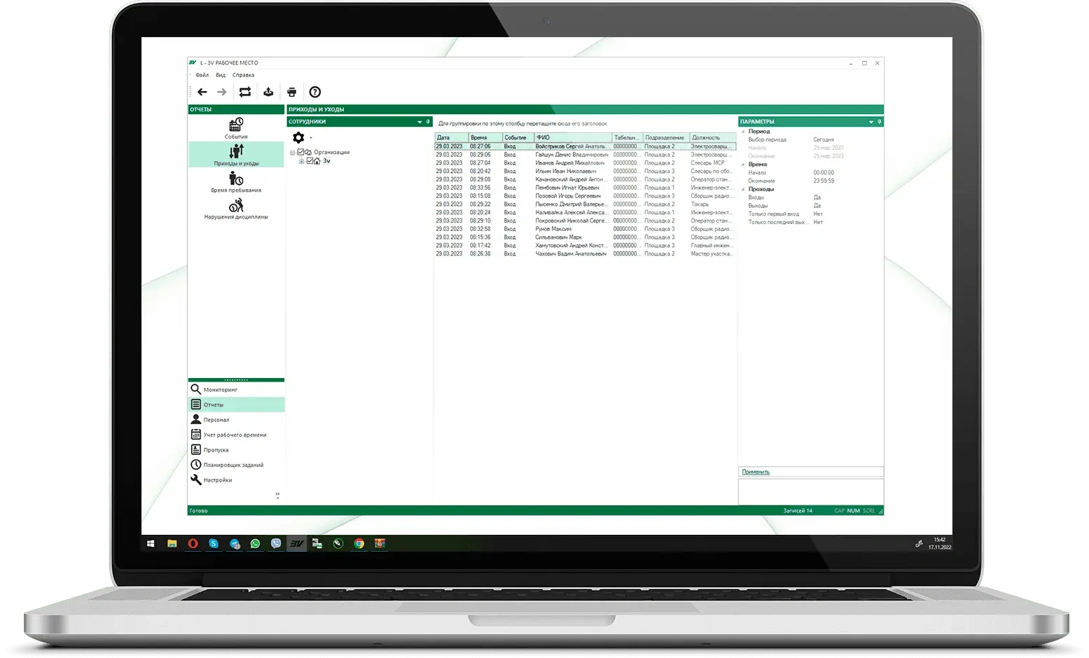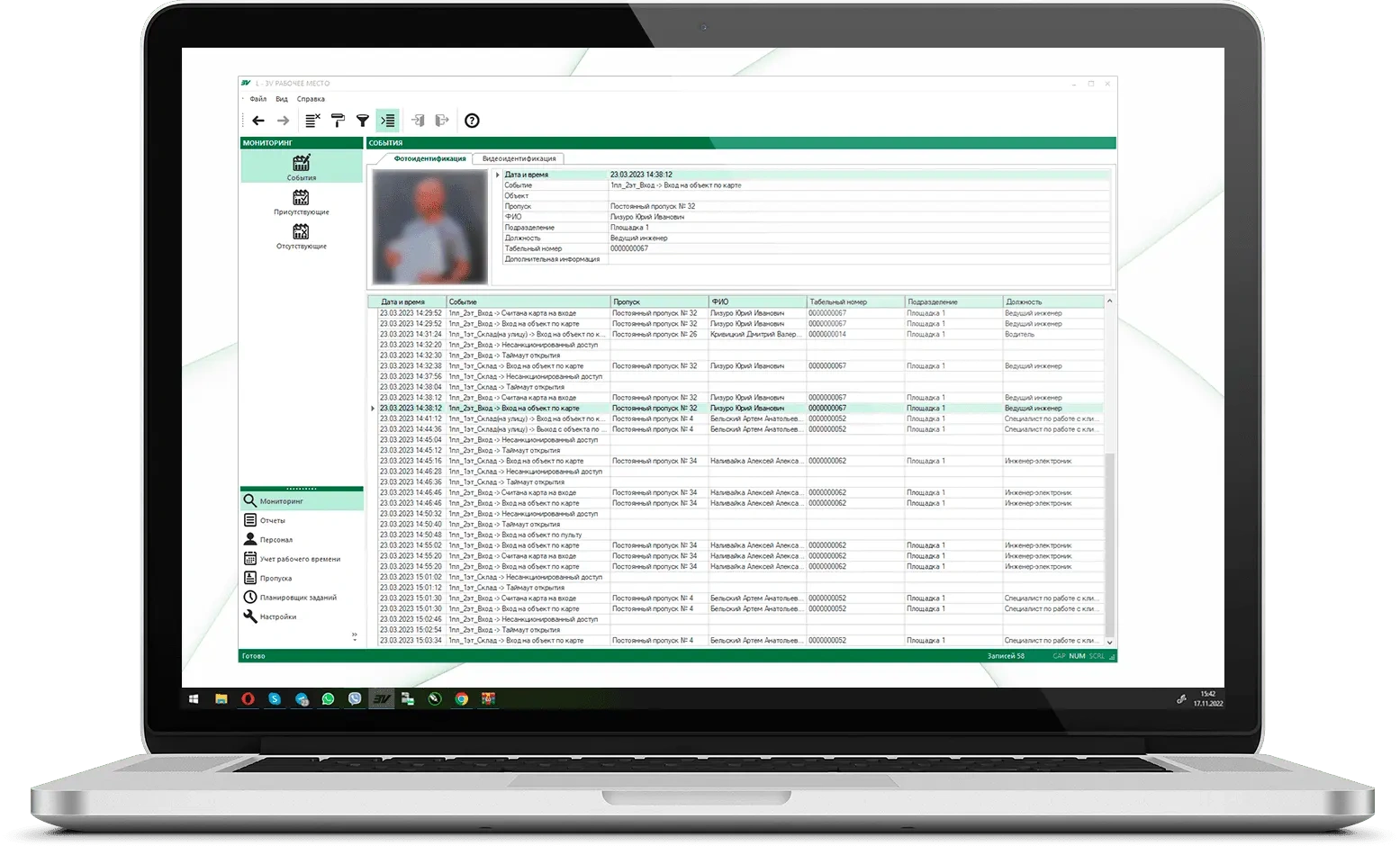 Также отображаются подробные данные по каждому событию: ФИО сотрудника, подразделение, должность, фотография. Можно назначить каждому событию свой цвет, а также настроить список выводимых событий и список оборудования, с которого выводятся события для каждого рабочего места.