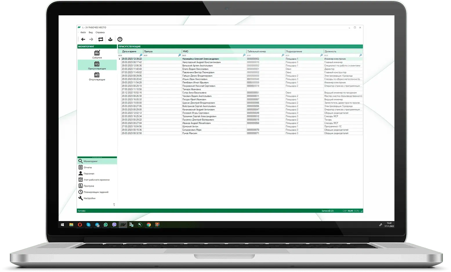 В режимах «Присутствующие» и «Отсутствующие» отображается список сотрудников на объекте.