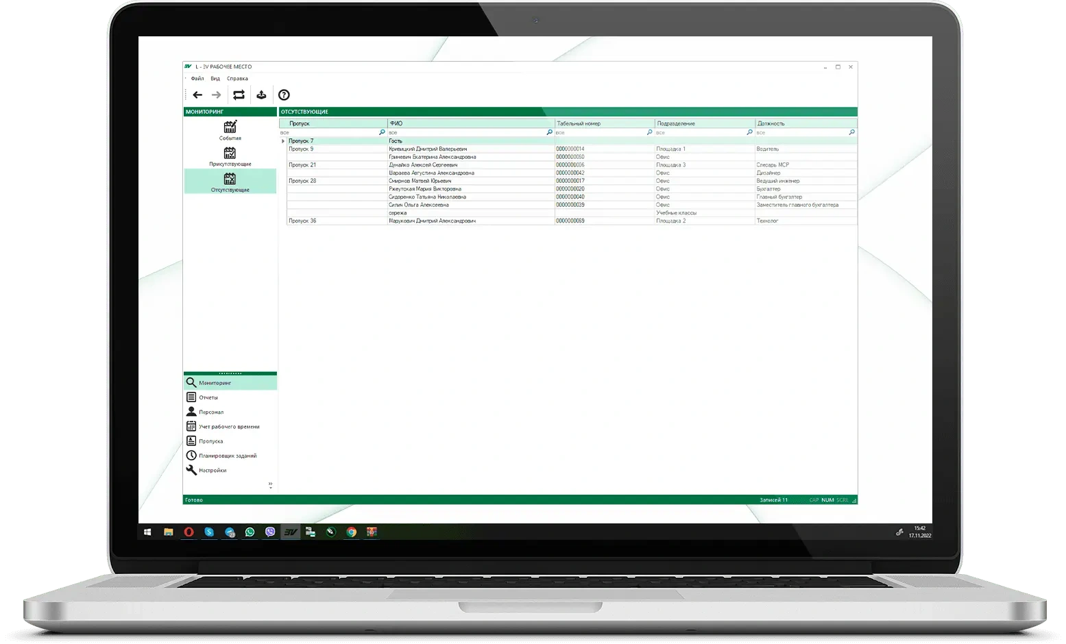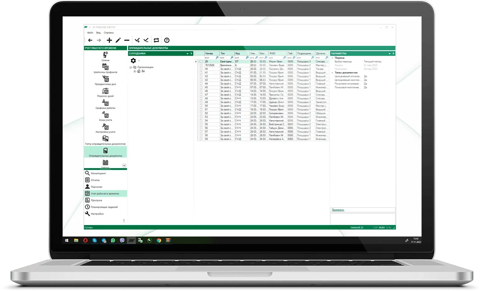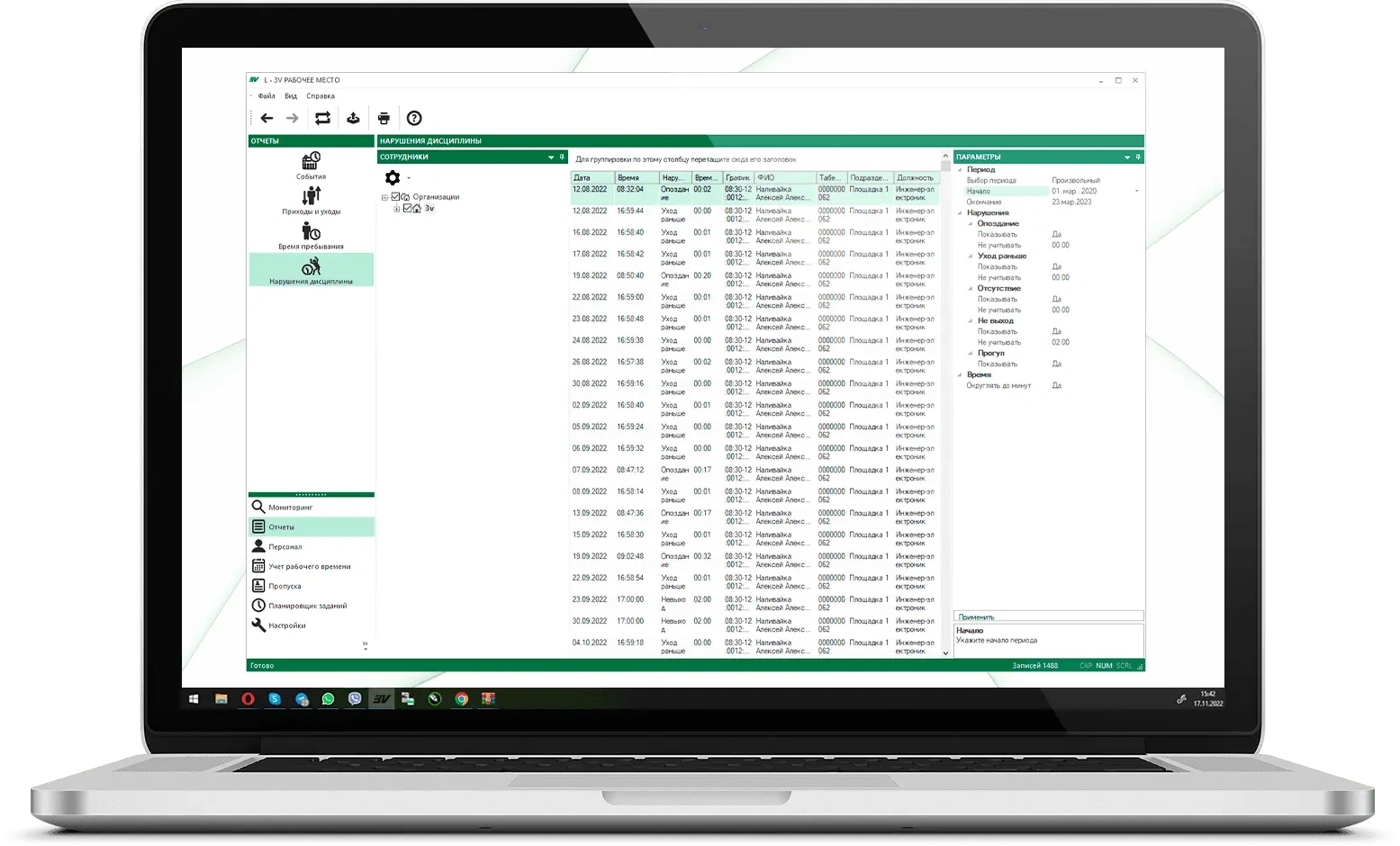 В модуле «Учёт рабочего времени» осуществляется полноценное ведение отчетности по работе сотрудников.