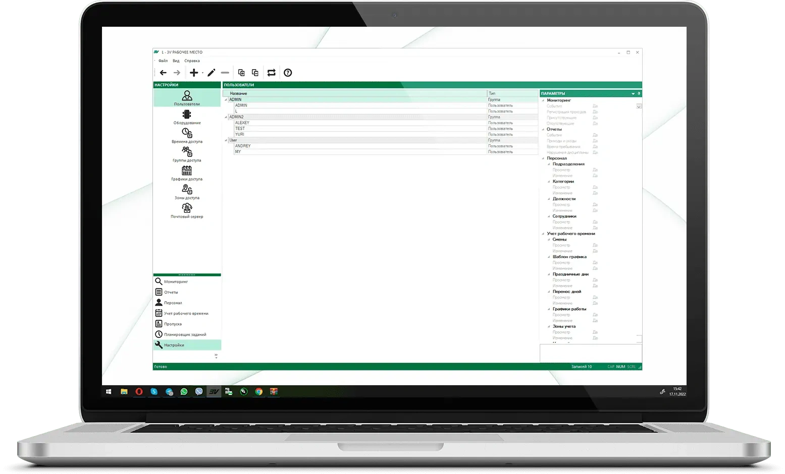 Модуль «Настройка» состоит из следующих режимов: пользователи, оборудование, времена доступа, группы доступа, зоны доступа.