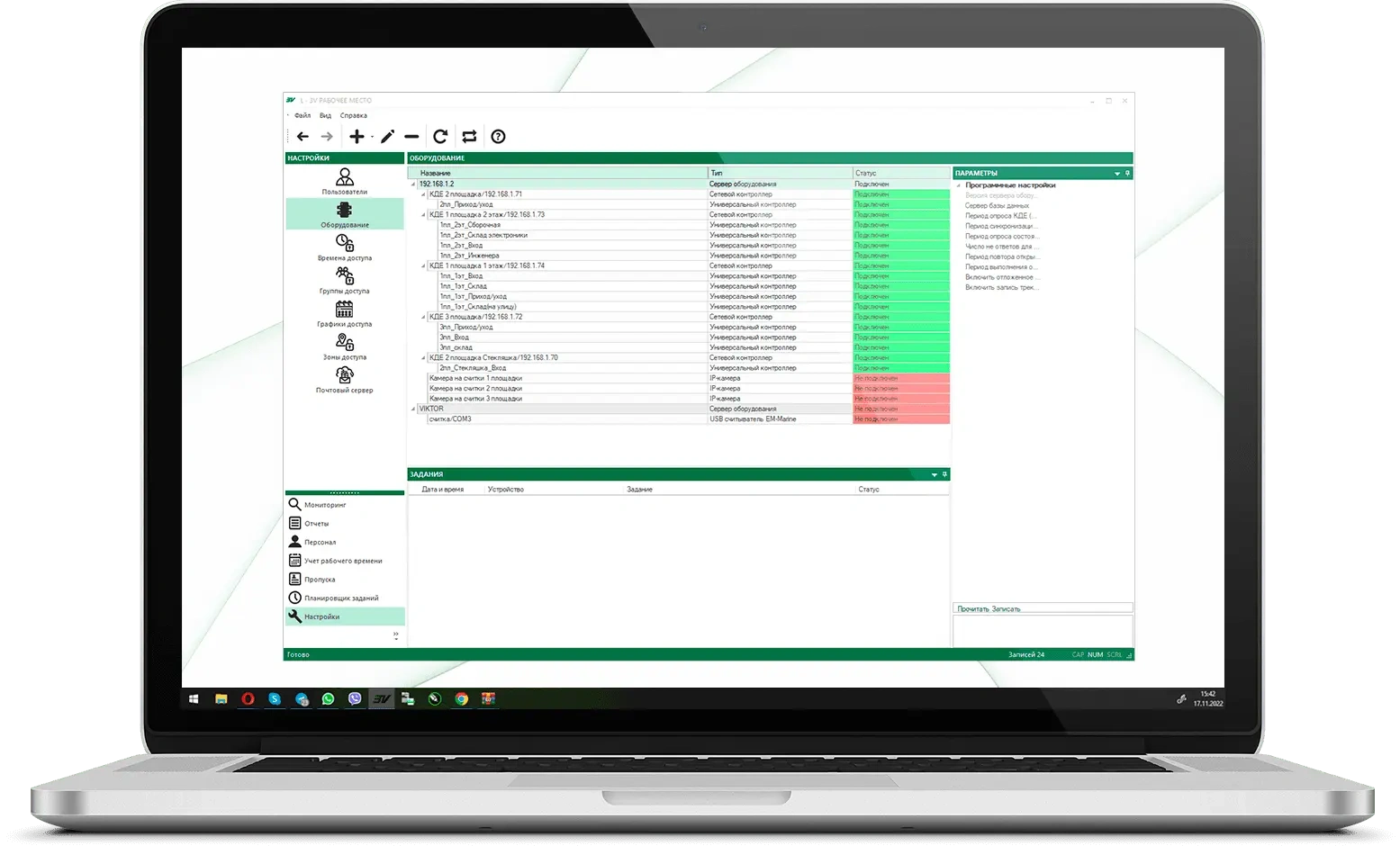 В режиме «Оборудование» производится добавление оборудования в систему (сетевые контроллеры, турникеты, двери, алкотестеры, считыватели и др.), изменение настроек оборудования, а также слежение за состоянием оборудования.
