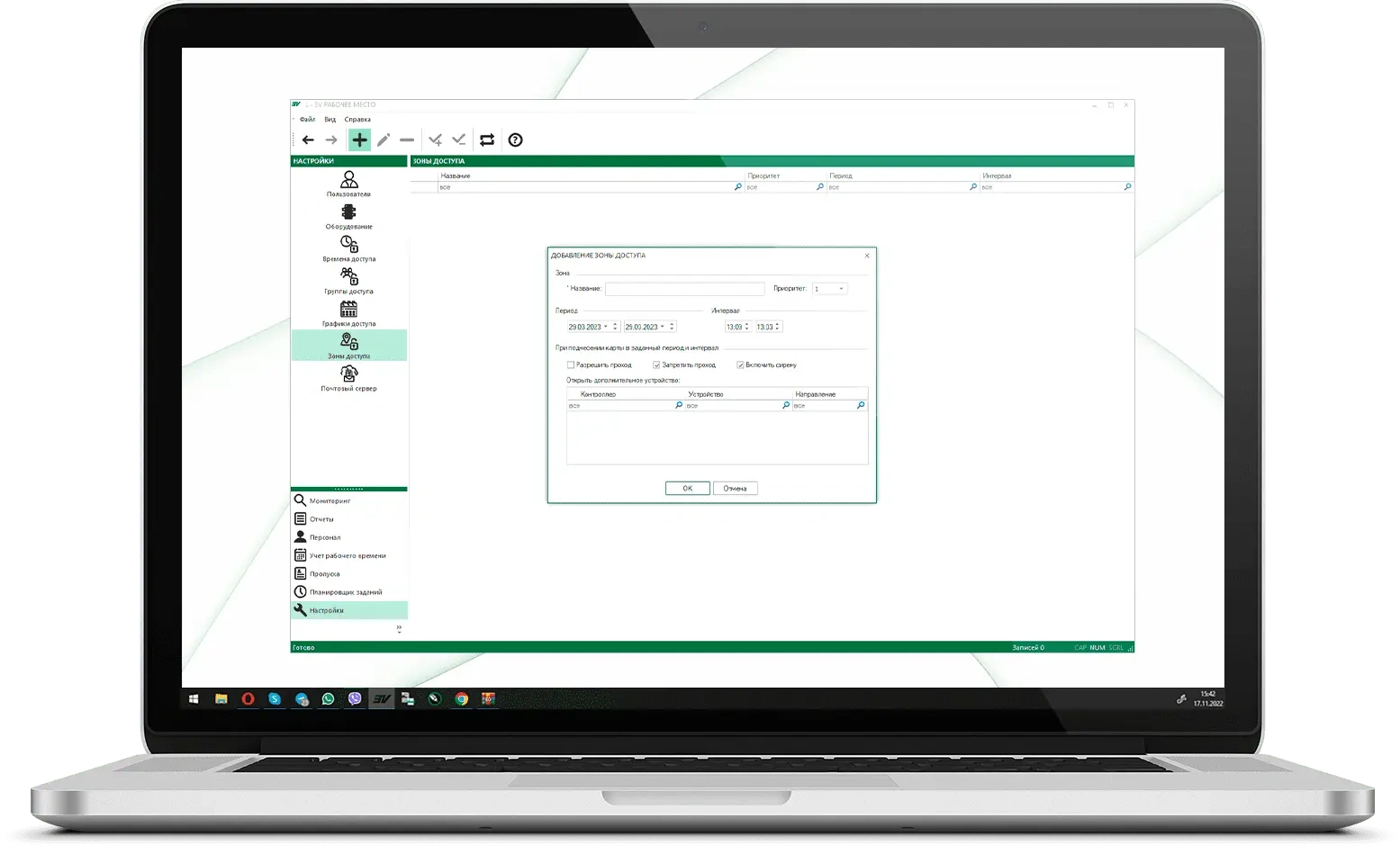 с привязкой к временным промежуткам, а также запись прав доступа в оборудование.