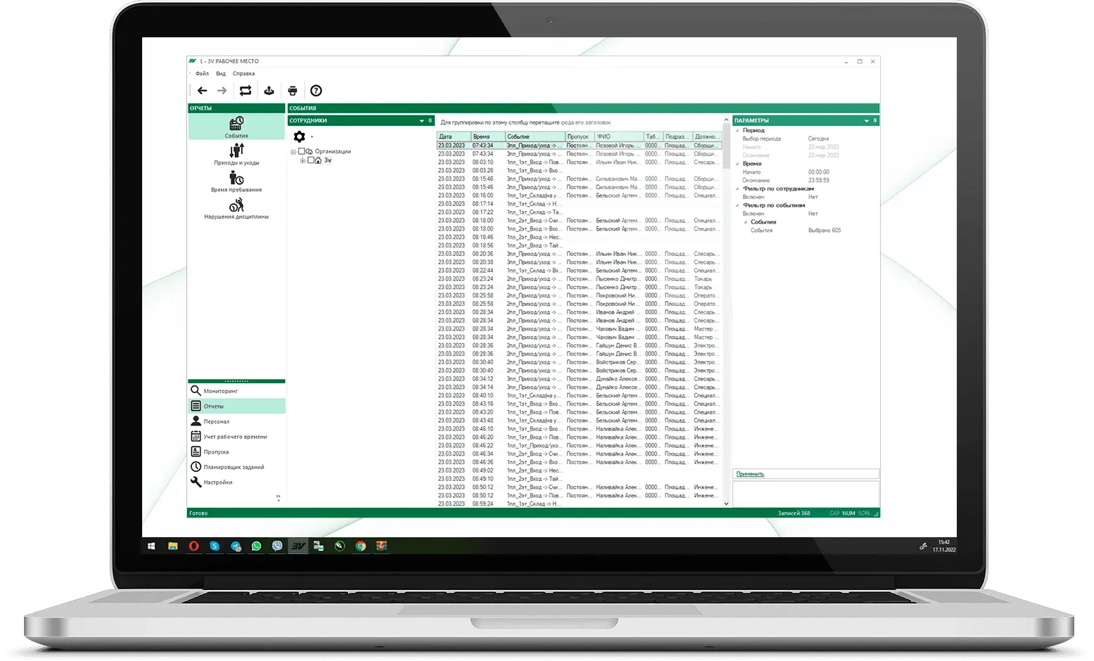 В режиме «События» можно вывести список событий за произвольный промежуток времени, с произвольного оборудования сотрудников произвольного подразделения с выбором типа сотрудника.