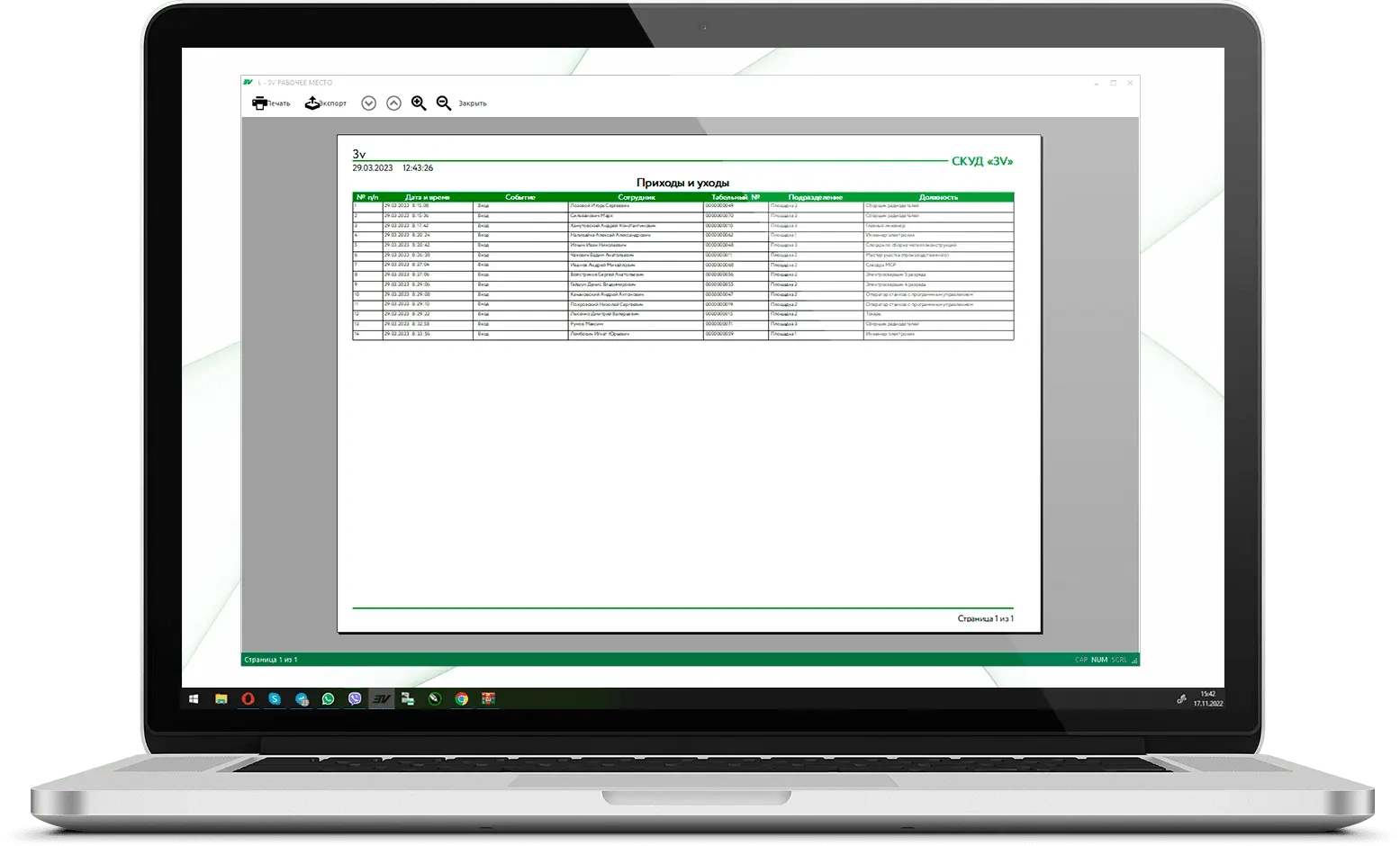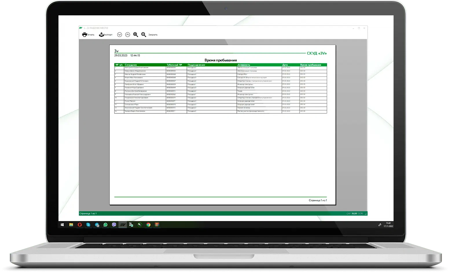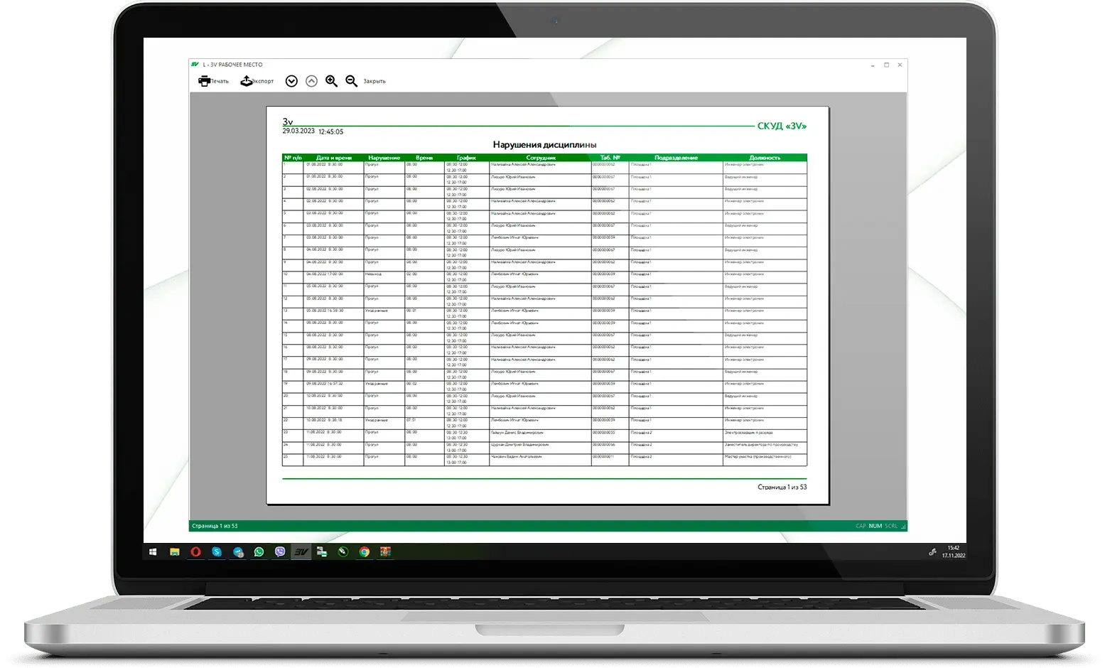 списком сотрудников, создавать и выводить на печать пропуска, производить контроль за системой в реальном времени, выводить отчёты по