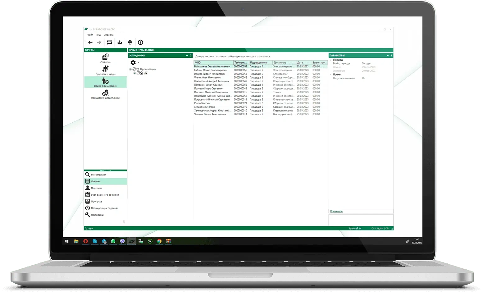 Отчёт «Время пребывания» позволяет рассчитать время нахождения сотрудника на объекте исходя из данных о его проходах.