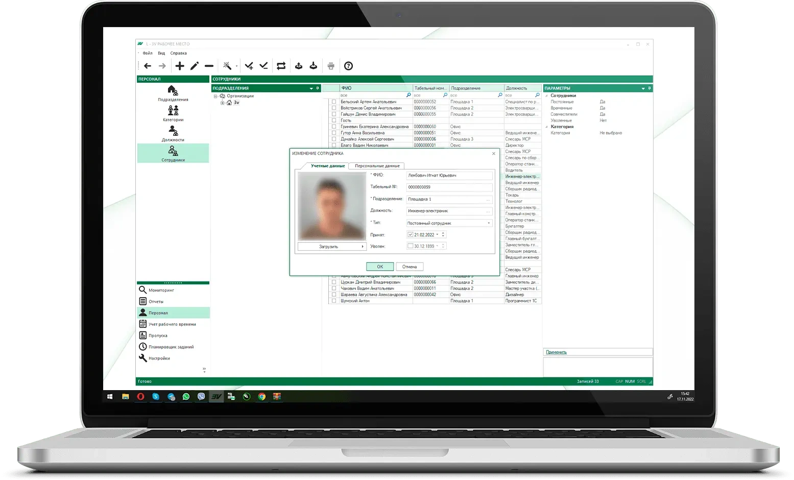 В режиме «Сотрудники» осуществляется управление списком сотрудников, внесение личных данных сотрудника, выбор должностей, подразделений, загрузка и редактирование фотографий сотрудников, приём и увольнение сотрудников.