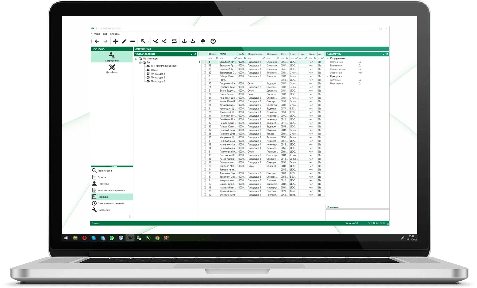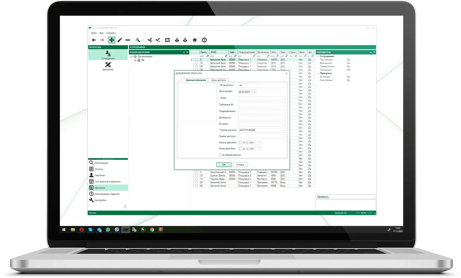 Модуль «Пропуска» позволяет выдавать каждому сотруднику пропуск, производить считывание идентификатора карты, и запись пропусков в оборудование.