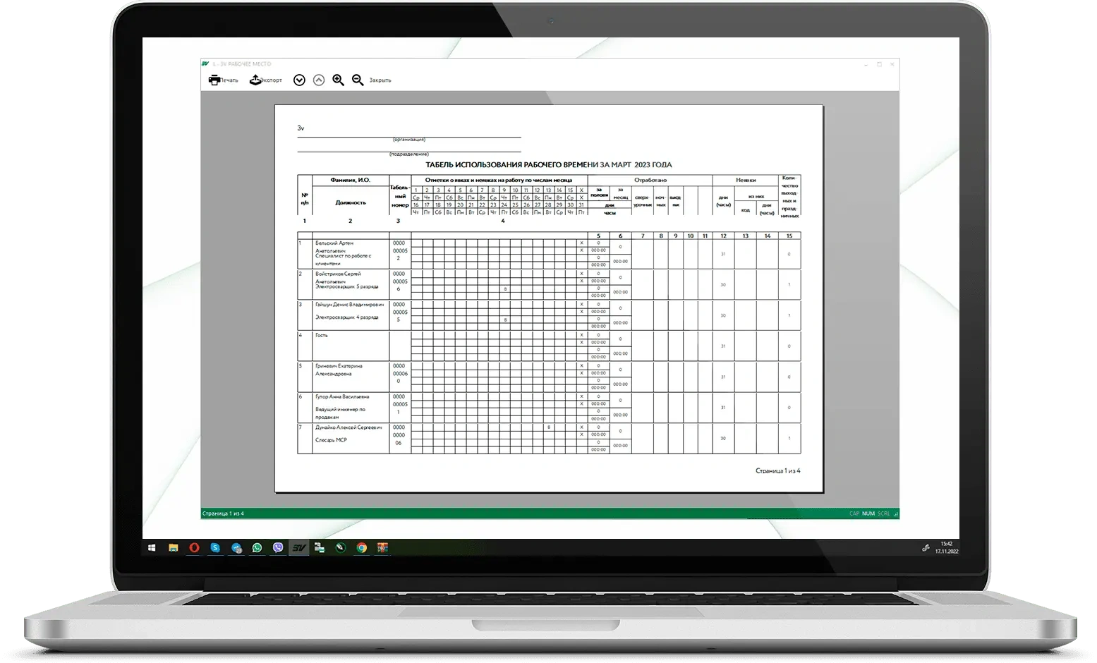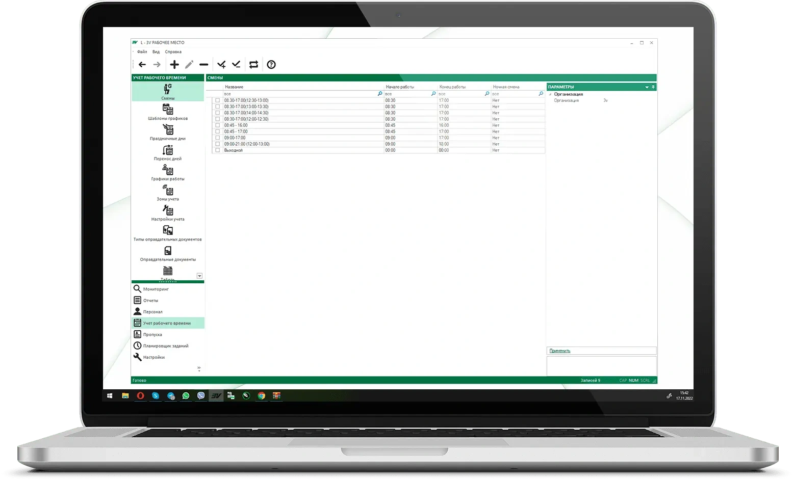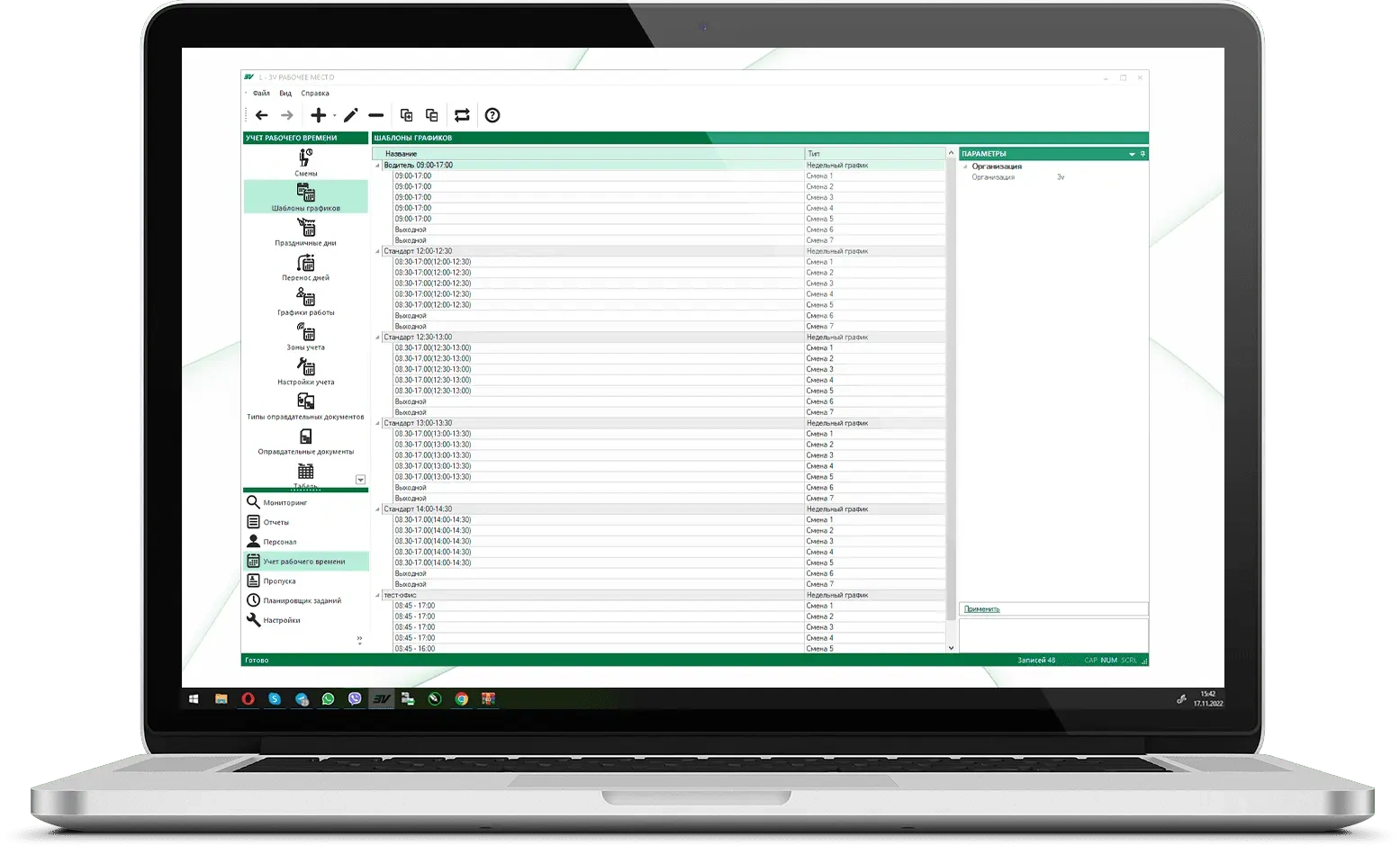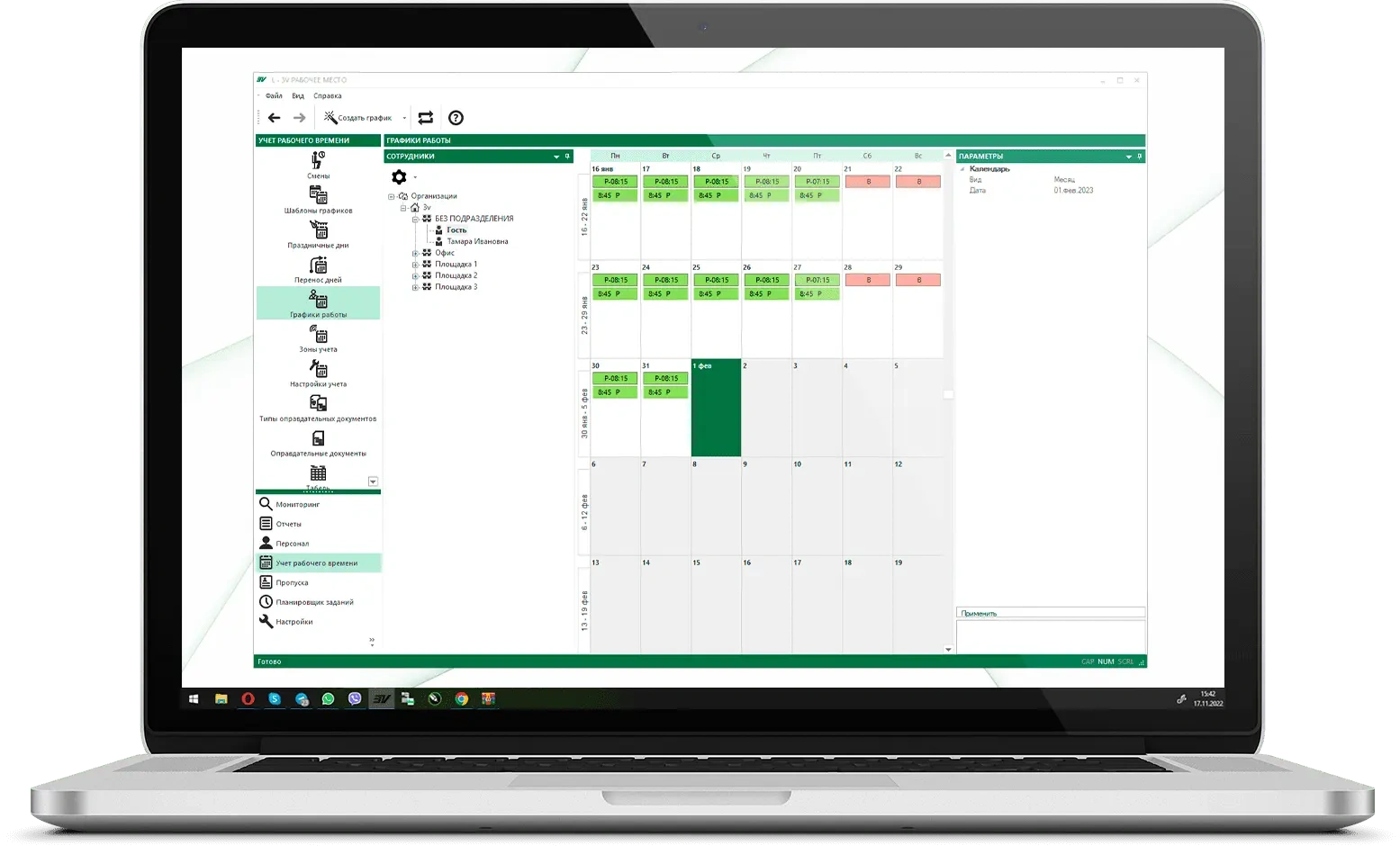 нарушениям, вести учёт рабочего времени от организации графиков работы до печати табелей.