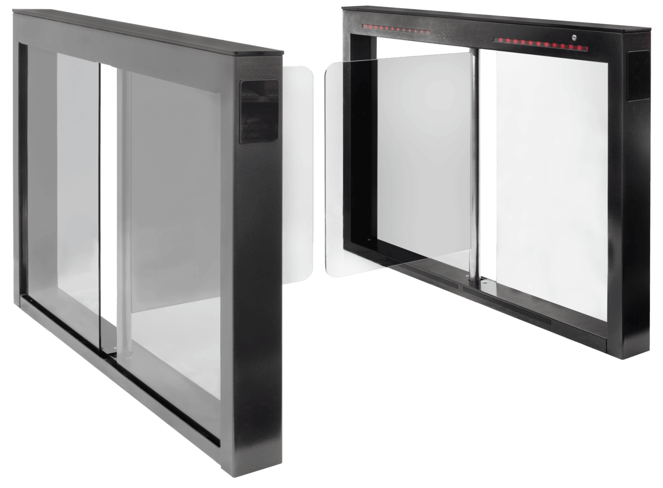 Турникет для скоростного прохода со стеклянными створками, состоящий из двух одиночных стоек покрытых полимерной краской и лаком «Звёздная ночь».
