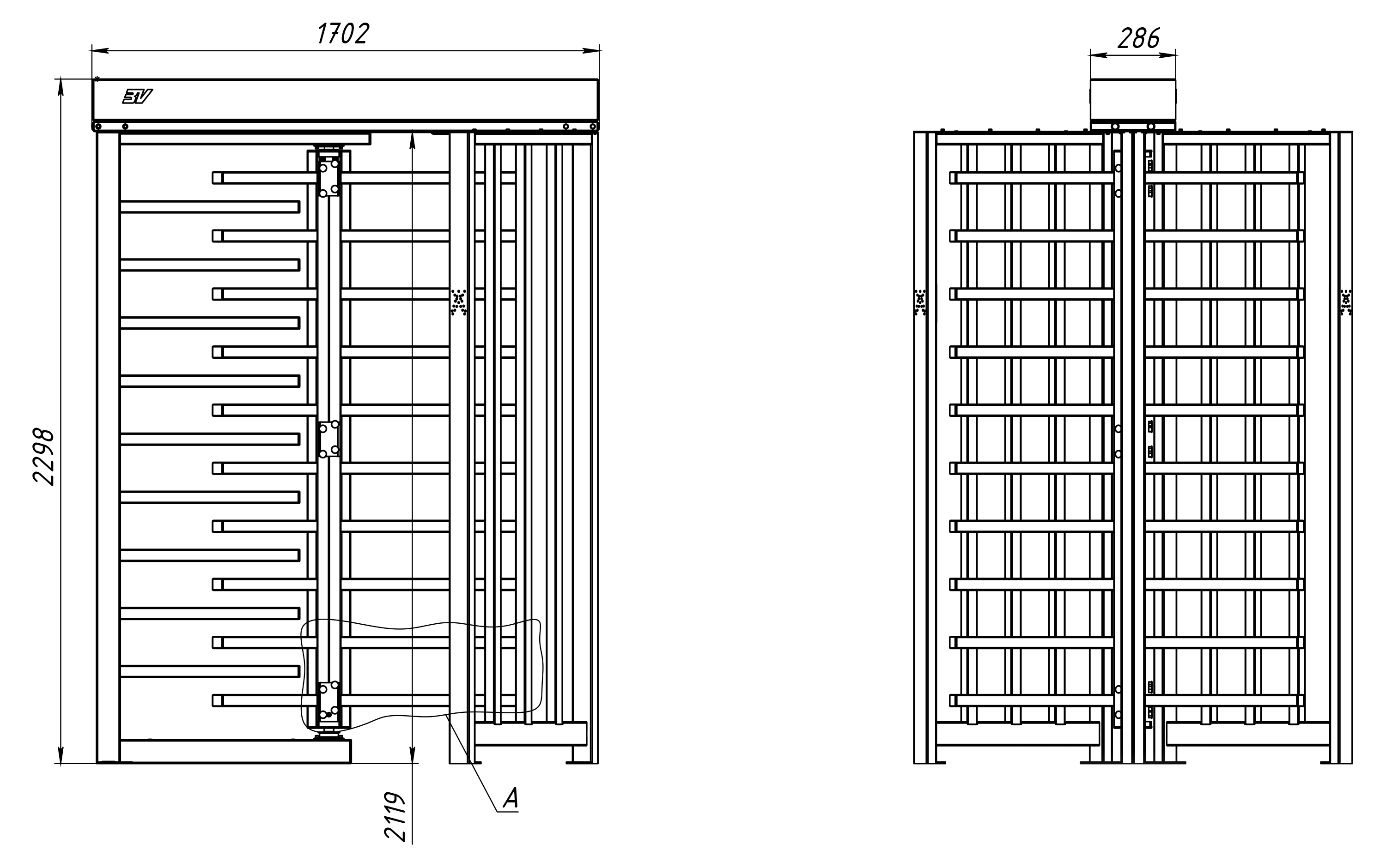 Отличительная особенность 3V Model X – это полноростовое исполнение с преграждающими элементами и формирователями прохода с фосфатированным полимерным покрытием. Формирователи прохода (боковые стенки) турникета решётчатые, зашиты вертикальными планками (квадратная труба 40 x 40 мм, длина – 630 мм) с шагом 180 мм. Вращающаяся по вертикальной оси стойка разделена на три равных сектора с 10 горизонтальными планками.