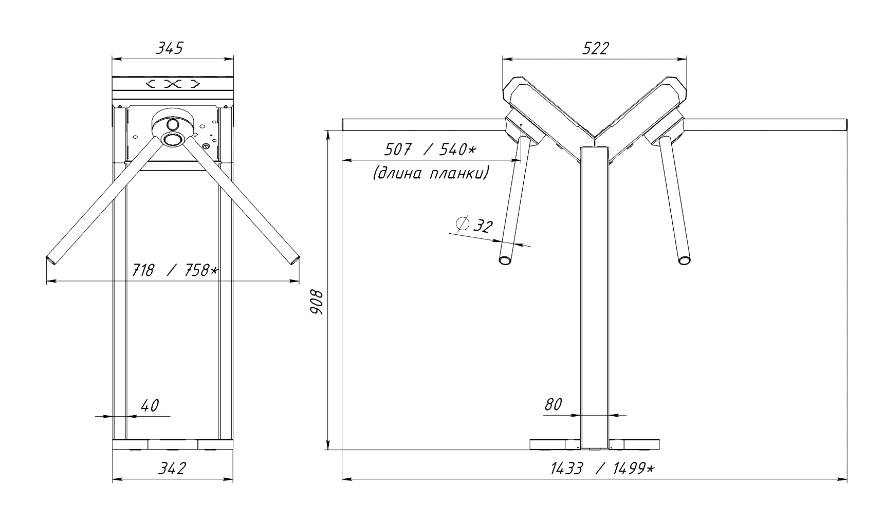 | Тип турникета | турникет-трипод двупроходный стоечный электромеханический |